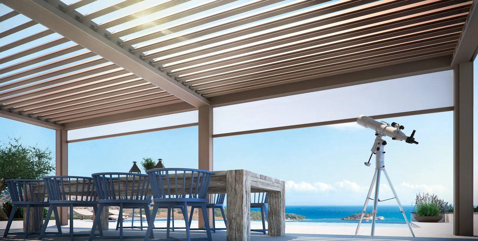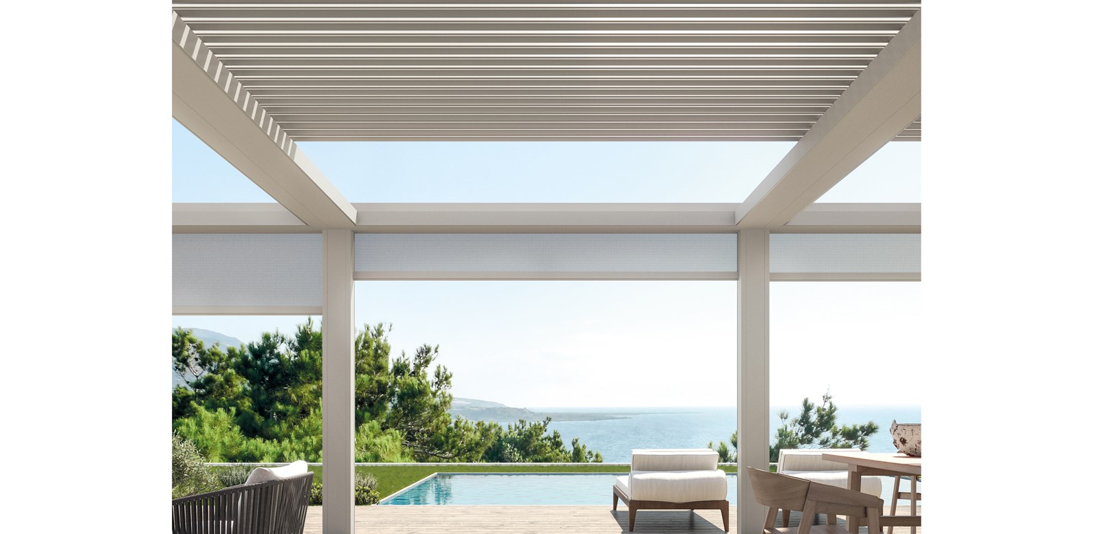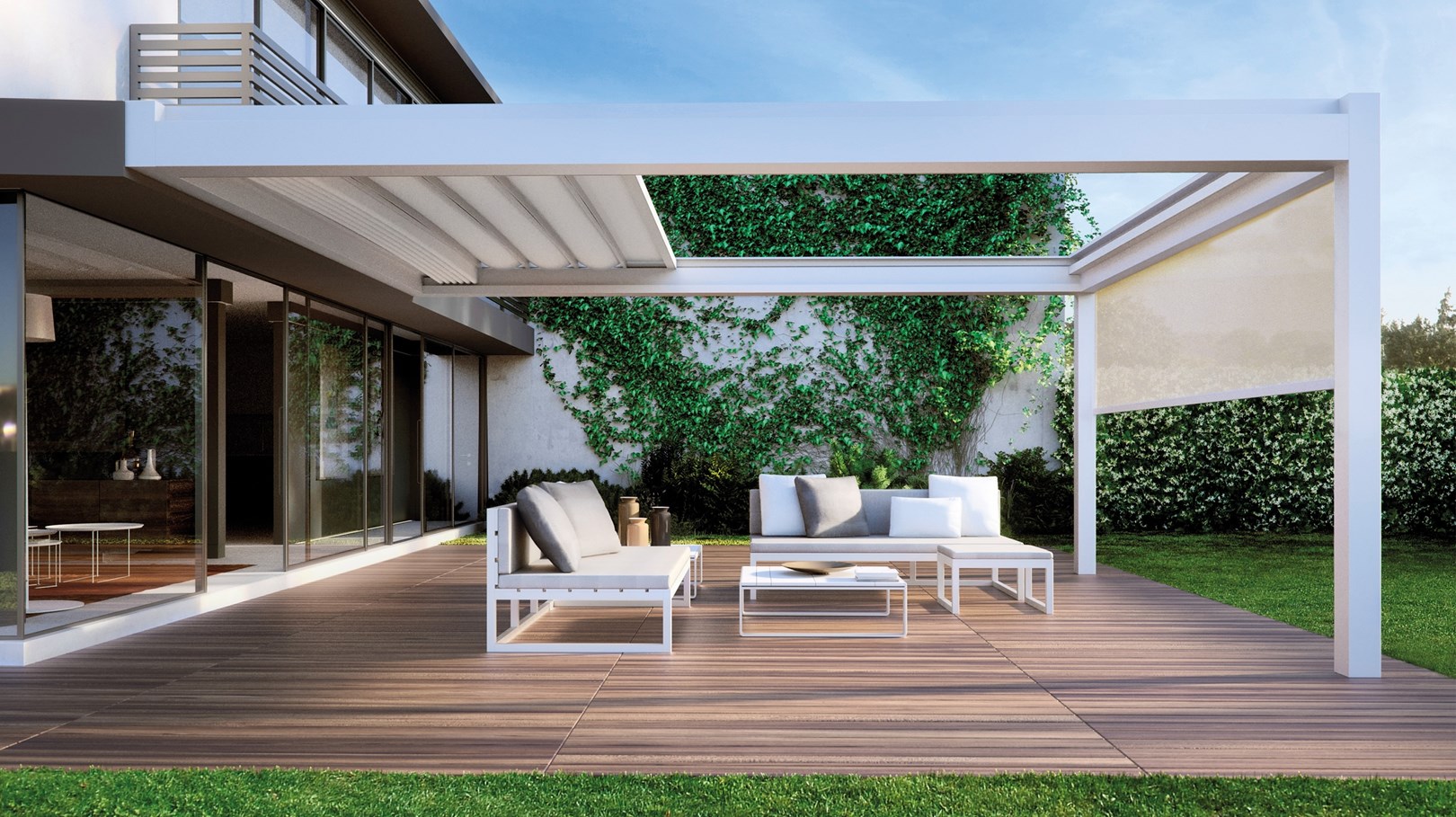 Pergola med alternerande fasta och rörliga lameller för optimalt ljusinsläpp med tillval vertikalmarkiser.