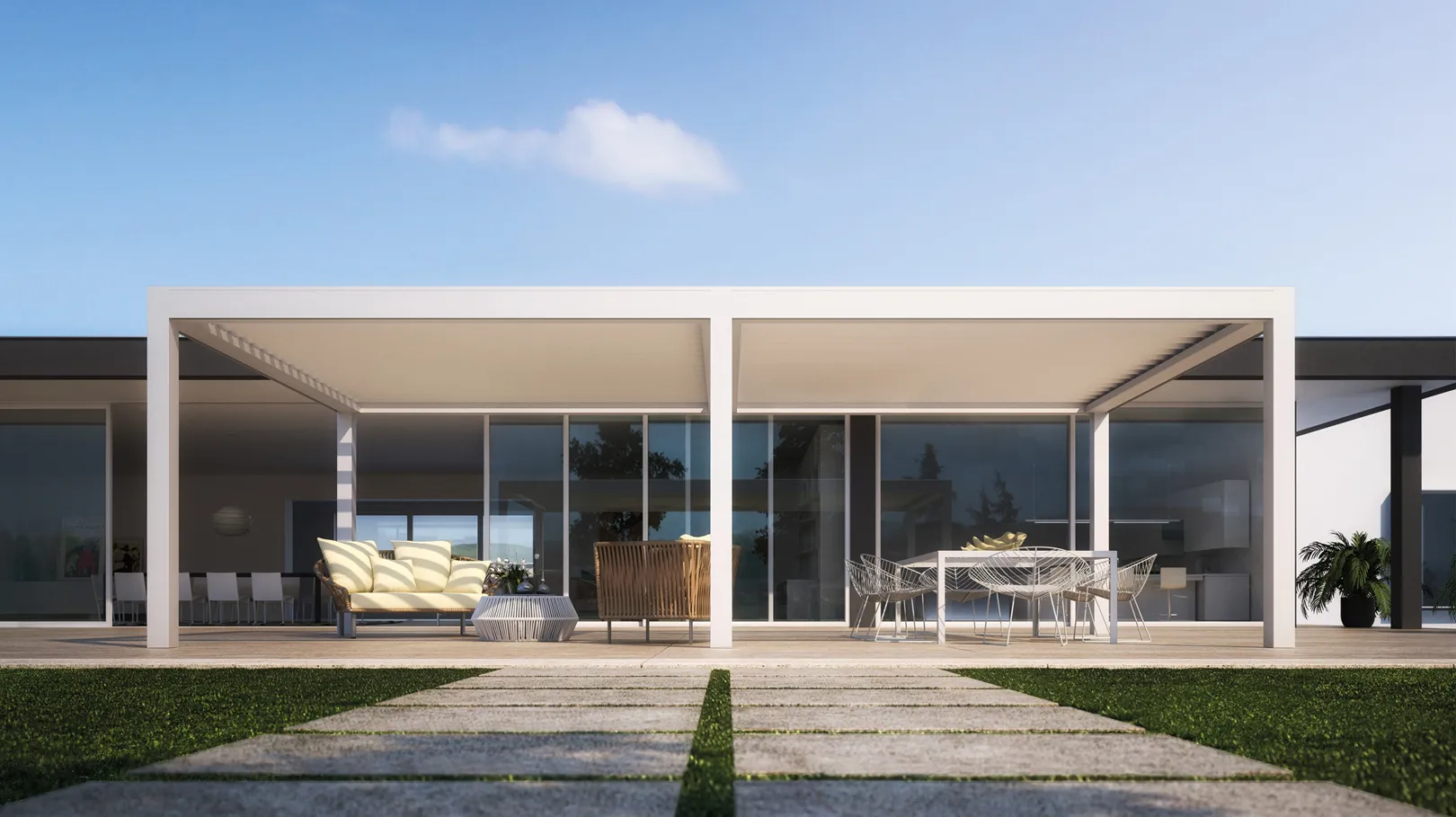 Elegant aluminium pergola med motordrivna aluminiumlameller som kan vinklas hela 140°