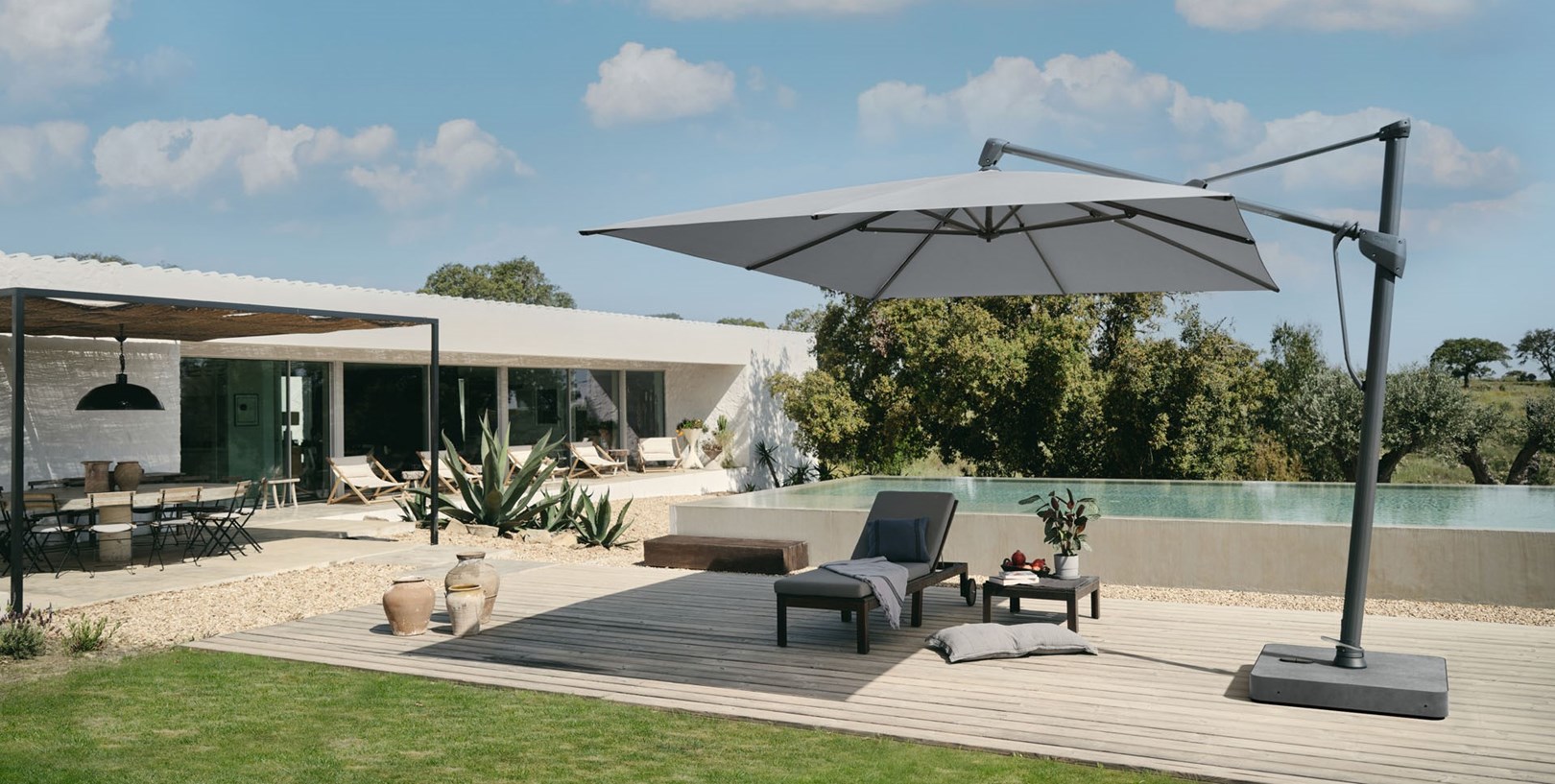 Vårt mest populära parasoll - Upp till 6x5 m. Klarar vindar upp till 70 km/h. Optimalt väderskydd för stora ytor.