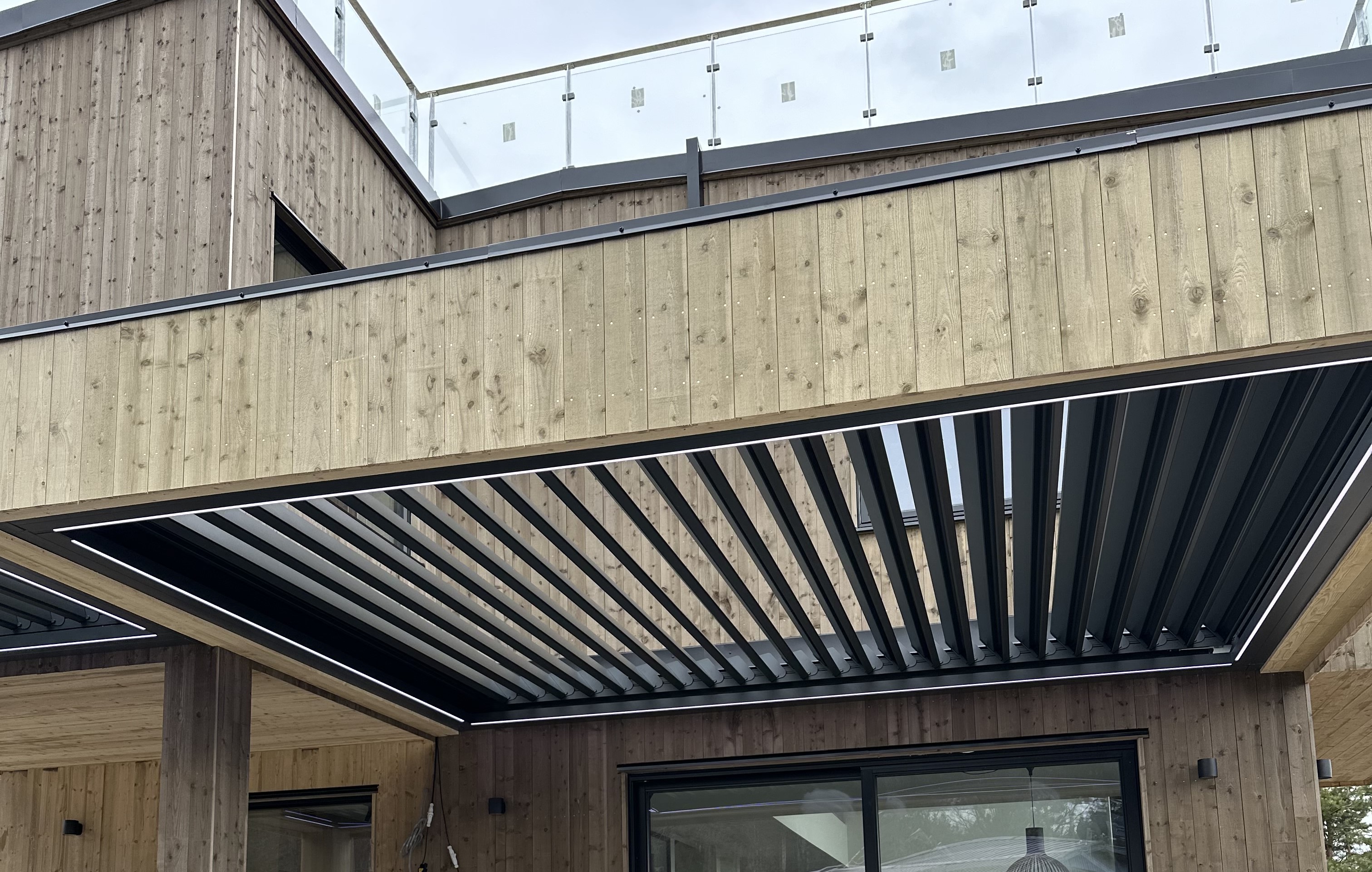 Specialkonstruktion där vi byggde in pergolan i befintlig trästomme för att matcha husfasaden.
