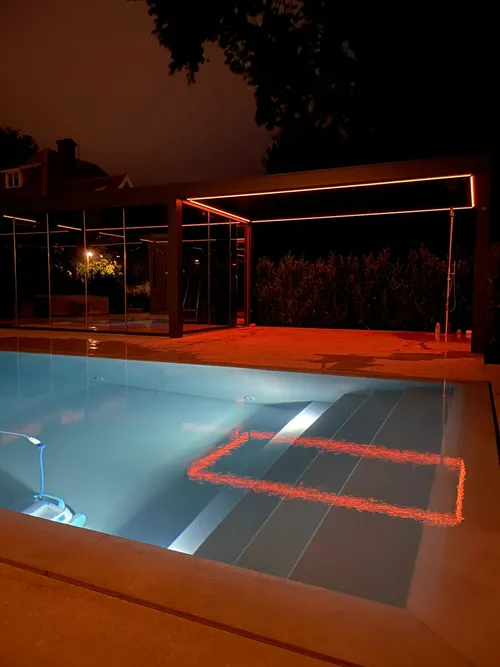 Här byggde vi två stycken sammankopplade modell Opera. En av modulerna glasades in med skjutpartier i spegelglas vilket skapade en väldigt snygg effekt mot poolen. Den andra pergolan lät vi vara öppen med endast stommen för att bra taklösning för utomhusduschen som installerades under taket.